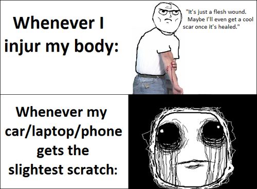 Whenever I injur my body: 'It's just a flesh wound. Maybe I'll even get a cool scar once it's healed.' Whenever my car/laptop/phone gets the slightest scratch: